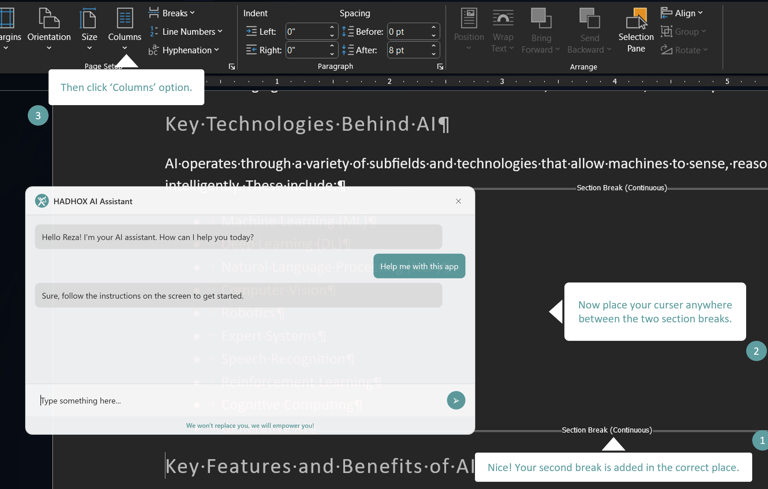 Get your work done without the tech headache. HADHOX shows you exactly where to click and what to do in tools like Microsoft Word.